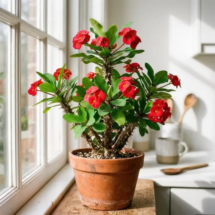 πͺ΄ Keep It Snug. A slightly root-bound Crown of Thorns flowers more generously than one in an oversized pot. Resist the urge to repot until the plant truly needs it.