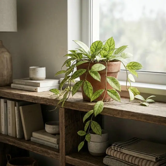 With leaves as hard as plastic and dark veins that look like a prehistoric map, Hoya Callistophylla is a structural masterpiece. It blooms with porcelain-like flowers that smell of citrus.