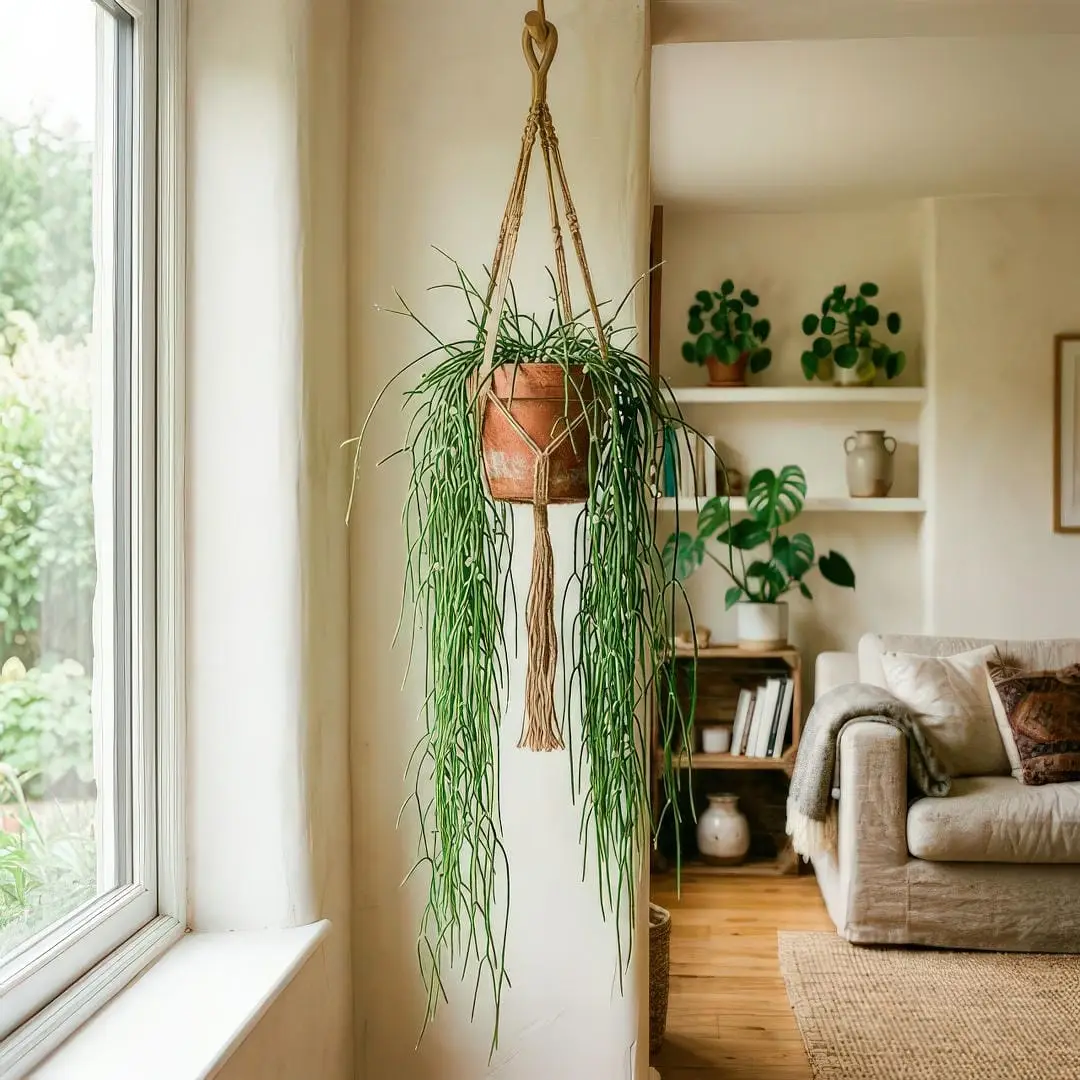The obvious best choice, and for good reason. A mature Rhipsalis in a macrame hanger looks like a living green chandelier with stems cascading several feet downward. Hang it near a bright window (but not in direct sun) and let gravity do the styling for you. This is also the best way to give the plant maximum air circulation, which it loves.