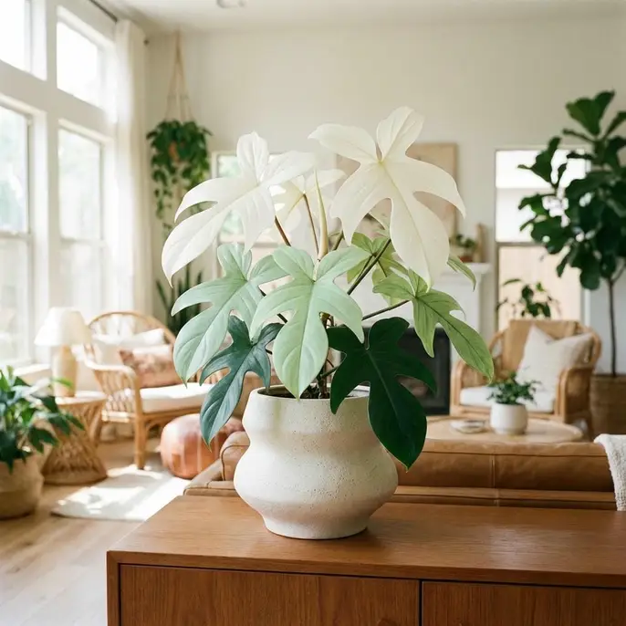 - Grouping: Group it with dark green, broad-leaf plants (like a Ficus Elastica or Monstera Deliciosa) to highlight the delicate texture and color difference. The "Ghost" stands out in a sea of green.