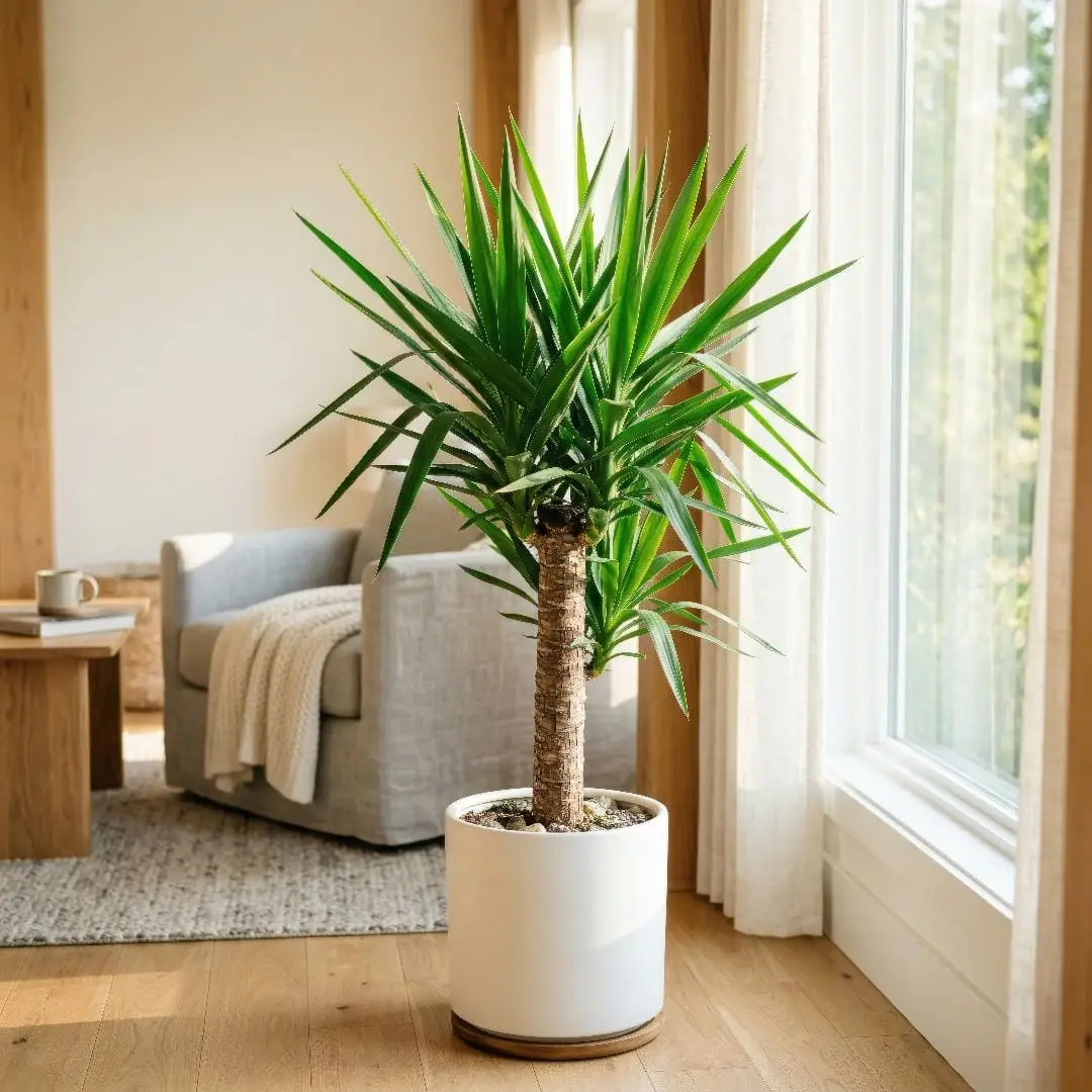 Compared with a Snake Plant, Yucca Cane usually wants more light to keep its form tight. If the room is dim, the leaves stretch, the rosette loosens, and the plant loses that crisp architectural look.